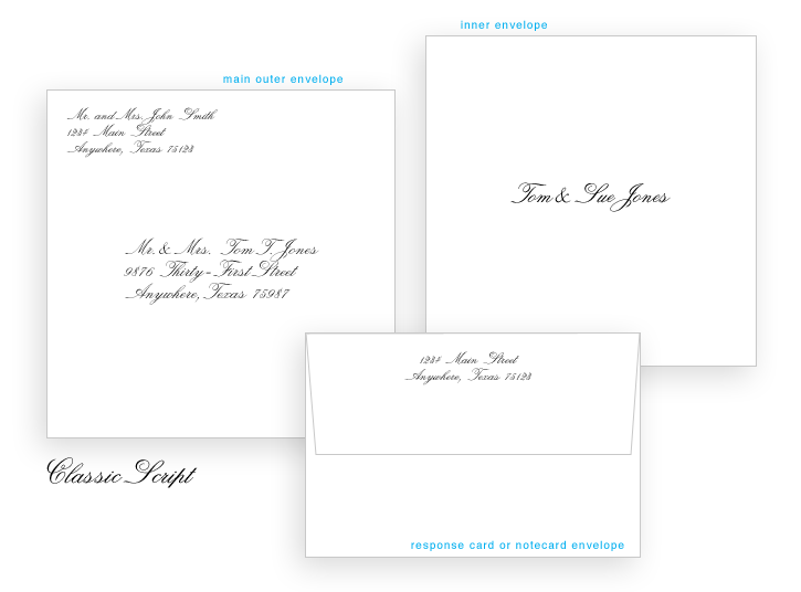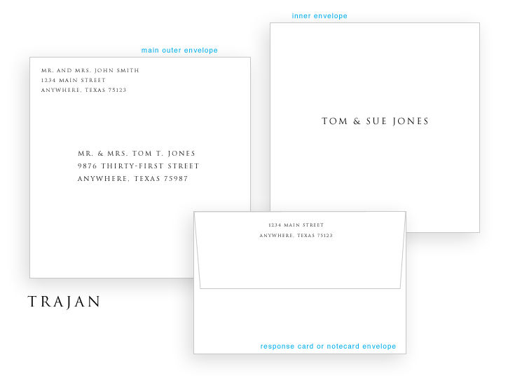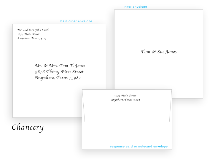 As part of many accessory options offered by Forevermore, professional envelope printing is available. The examples below are shown as sets. However, the requirements for any given ensemble may be different. The three typeface examples are standard. Other typefaces are available for an additional charge.